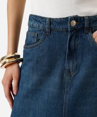 Saia midi feminina confeccionada em jeans. A peça tem modelagem evasê, com caimento solto ao corpo e recorte frontal. O modelo tem cintura alta, cós com passantes para cinto e o fechamento é por zíper e botão. Possui três bolsos na parte frontal e dois aplicados na parte posterior. Detalhe de acabamento em pesponto contrastante.