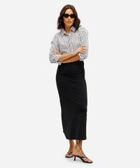 Saia midi feminina confeccionada em malha de poliamida. A peça tem modelagem reta com caimento levemente ajustado ao corpo e franzidos laterais que modelam a silhueta. O modelo tem cintura alta e cós fino com elástico embutido. Detalhe de acabamento pespontado na barra.