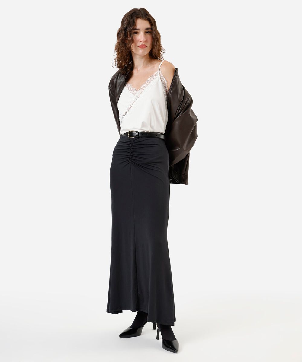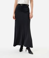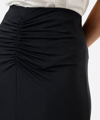 Saia midi feminina confeccionada em malha. A peça tem modelagem evasê com caimento reto e solto ao corpo. O modelo tem cintura alta e cós elástico. Possui detalhe de franzido frontal e acabamento pespontado na barra.