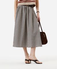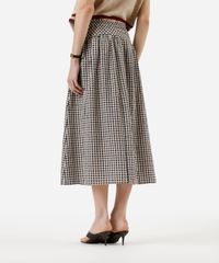 Saia midi feminina confeccionada em tecido plano texturizado com algodão e padronagem xadrez. A peça tem modelagem evasê com caimento reto e solto ao corpo e recorte superior formando franzidos. O modelo tem cintura alta, cós com elástico embutido e acabamento pespontado na barra.