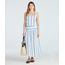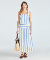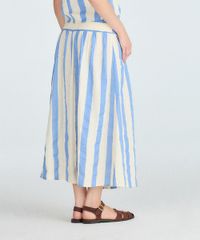 Saia feminina confeccionada em algodão com toque macio. A peça possui modelagem godê com caimento solto, cintura alta, cós simples com lastex posterior, detalhe de pregas, padronagem listrada e acabamento pespontado.