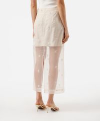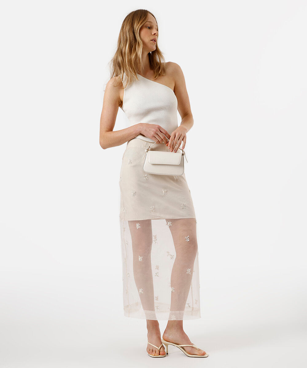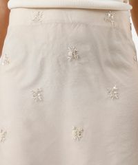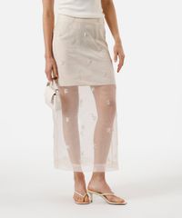 Saia midi feminina confeccionada em organza com bordados. A peça tem modelagem reta com caimento levemente ajustado ao corpo. O modelo tem cintura alta, cós liso e fechamento lateral por zíper invisível. Possui forro em tecido plano, fenda posterior e acabamento pespontado na barra.
