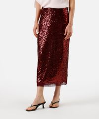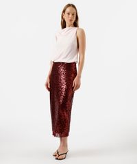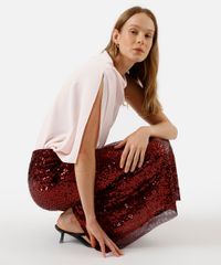 Saia midi feminina confeccionada em tule bordado de paetês. A peça tem modelagem reta com caimento solto ao corpo. O modelo tem cintura alta, cós com elástico embutido e fechamento por zíper. Possui forro em malha fenda posterior e acabamento com transparência na barra.
