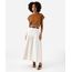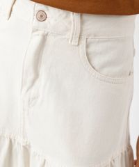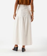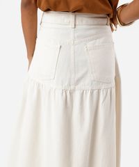 Saia midi feminina confeccionada em sarja. A peça tem modelagem evasê, com caimento rodado e solto ao corpo e recorte inferior formando franzidos. O modelo tem cintura alta, cós com passantes para cinto e o fechamento é por zíper e botão. Possui três bolsos na parte frontal e dois aplicados na parte posterior. Detalhe de acabamento simples na barra.