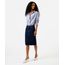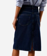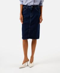 Saia midi feminina confeccionada em jeans. A peça tem a modelagem e construção reta, caimento confortavelmente solto ao corpo. O modelo tem cintura alta, cós com passantes para cinto e fechamento frontal por botão e zíper. Possui fenda, três bolsos na parte frontal e dois posteriores. Detalhe de acabamento pespontado nas barras.