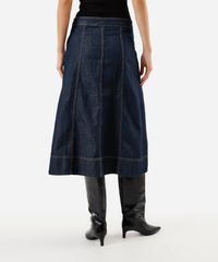 Saia midi feminina confeccionada em jeans com elasticidade. A peça tem modelagem evasê com caimento reto e solto ao corpo e fenda sobreposta lateral. O modelo tem cintura alta, cós liso e fechamento por zíper. Detalhe de acabamento em pesponto contrastante.