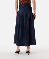 Saia midi feminina confeccionada em jeans. A peça tem modelagem godê com rodado e solto ao corpo e pregas no contorno. O modelo tem cintura média, cós liso e o fechamento é por zíper. Detalhe de acabamento pespontado na barra.
