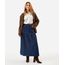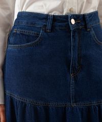 saia midi feminina jeans com recorte e franzidos cintura alta azul