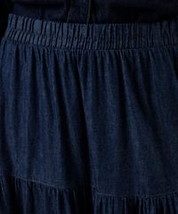 Saia midi feminina confeccionada em jeans. A peça tem modelagem godê, com caimento rodado e solto ao corpo e recortes que criam efeito de camadas. O modelo tem cintura alta e cós com elástico embutido. Possui dois bolsos faca na parte frontal e dois aplicados na parte posterior. Detalhe de acabamento pespontado na barra.