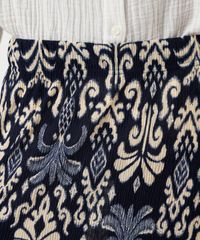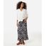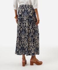 Saia midi feminina confeccionada em tecido plissado com estampa étnica. A peça tem modelagem evasê com caimento reto e solto ao corpo. O modelo tem cintura alta e cós liso com elástico embutido. Detalhe de acabamento pespontado na barra.