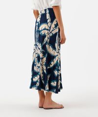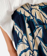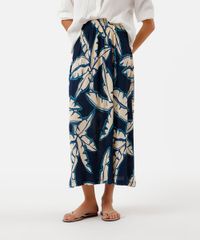 Saia midi feminina confeccionada em tecido plissado com estampa de folhagens. A peça tem modelagem evasê com caimento solto ao corpo. O modelo tem cintura alta, cós com elástico embutido e acabamento pespontado na barra.