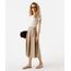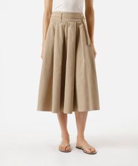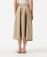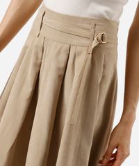 Saia midi feminina confeccionada em tecido plano com poliamida. A peça tem modelagem godê, caimento rodado e solto ao corpo com pregas largas no contorno. O modelo tem cintura alta, cós com passantes para cinto, cinto no mesmo material da peça e fechamento por zíper. Detalhe de acabamento simples na barra.