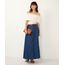 Saia feminina confeccionada em jeans azul escuro. A peça possui modelagem evasê com caimento solto, comprimento midi, cintura alta, cós com passantes aplicados, fechamento frontal por zíper, dois bolsos frontais estilo faca, detalhe de recortes e acabamento pespontado. Acompanha cinto em material sintético.