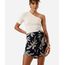 Saia curta feminina confeccionada em tecido plano de viscose com estampa de folhagens. A peça tem modelagem pareô com caimento levemente ajustado ao corpo com amarração lateral. O modelo tem cintura alta, cós liso e fechamento por zíper. Detalhe de acabamento pespontado na barra.