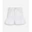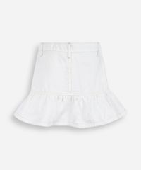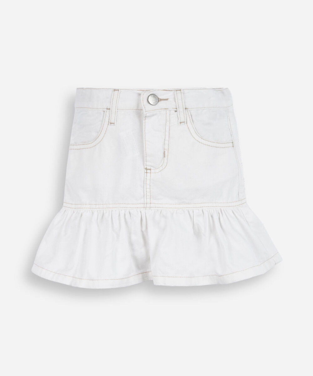 Saia curta infantil confeccionada em sarja. A peça tem modelagem peplum, caimento levemente ajustado ao corpo com recorte inferior formando volume e franzidos. O modelo tem cintura alta, cós com passantes para cinto e o fechamento por zíper e botão. Possui dois bolsos na parte frontal e acabamento pespontado na barra.