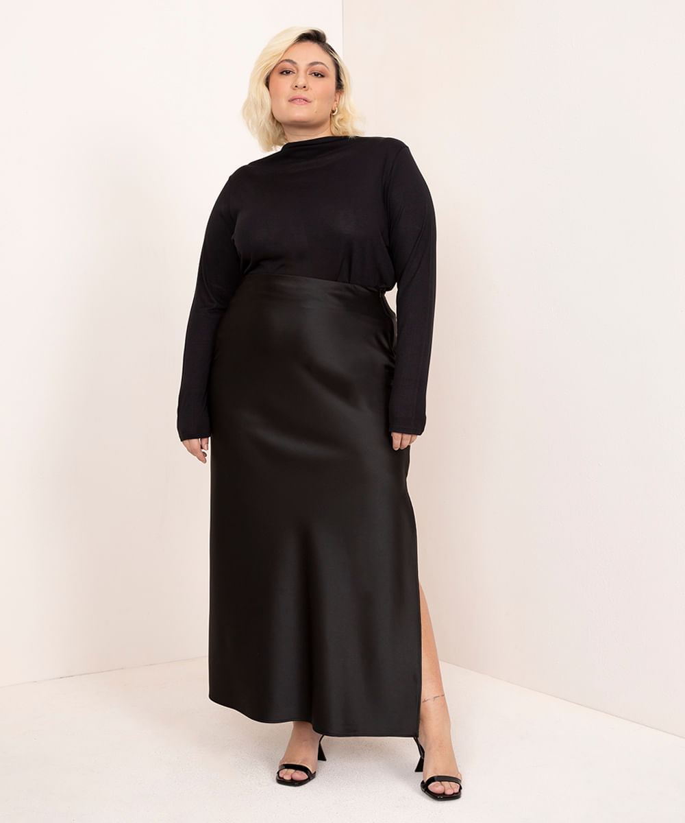 saia plus size midi com fenda mindset preto