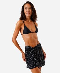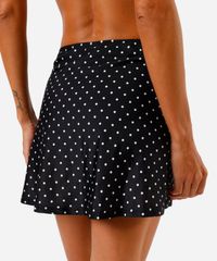 Saia curta saída de praia feminina confeccionada em malha de poliamida com estampa poá. A peça tem modelagem evasê com caimento solto ao corpo. O modelo tem cintura média, cós com franzidos e acabamento pespontado.