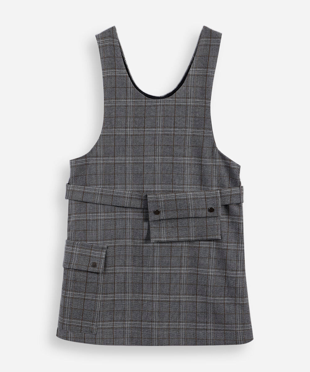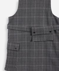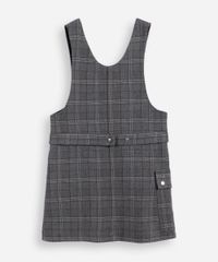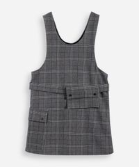 Salopete infantil confeccionada em tecido plano com viscose e estampa xadrez. A peça tem modelagem evasê e caimento solto ao corpo. O modelo tem decote redondo, alças médias e bolso utilitário lateral. Possui forro e acompanha pochete no mesmo material.