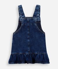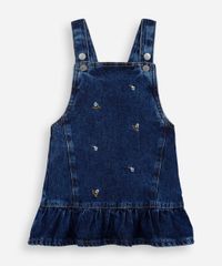 Salopete infantil confeccionada em jeans com bordados florais. A peça tem modelagem evasê, caimento reto e solto ao corpo com babado aplicado na barra. O modelo tem decote quadrado e alças largas ajustáveis. Detalhe de acabamento em pespontado contrastante.