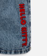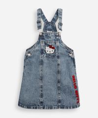 Salopete infantil confeccionado em jeans. A peça possui modelagem e caimento reto, decote reto, alças médias, fechamento por fivelas com ajustes e botão nas laterais, um bolso frontal com estampa bordada da personagem Hello Kitty, escrita em relevo e em cores contrastantes, detalhe frontal de recortes e acabamento pespontado.