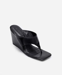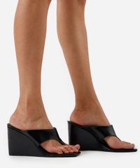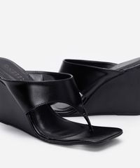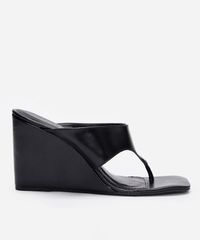 Sandália feminina desenvolvida em material sintético resistente. O modelo tem bico quadrado e cabedal com tira larga e suporte para encaixar os dedos. Possui solado com leve enchimento e inscrição de marca, salto anabela médio e sola texturizada que auxilia no caminhar.