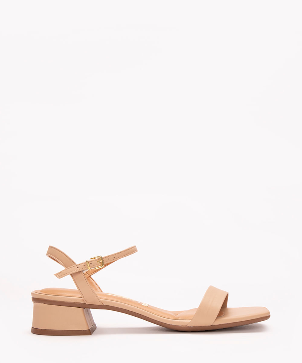 Sandália desenvolvida em material sintético com aspecto de couro. A peça possui bico quadrado, cabedal com uma tira fina e fechamento por fivela com níveis de ajuste. Palmilha macia, salto baixo e solado emborrachado.