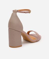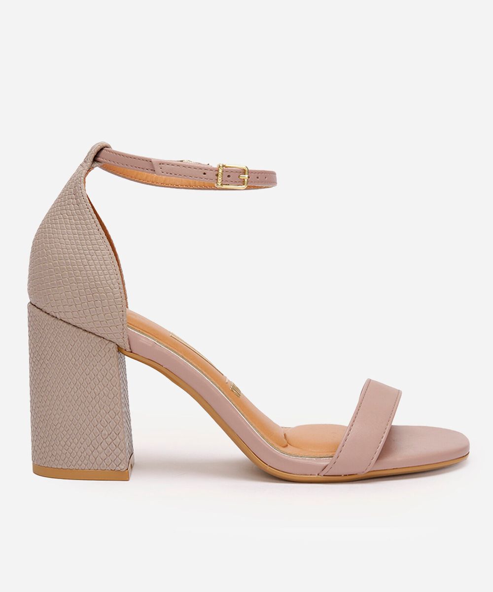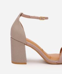 • Salto alto bloco de 8 cm com textura de cobra, que oferece estabilidade e um toque de tendência.