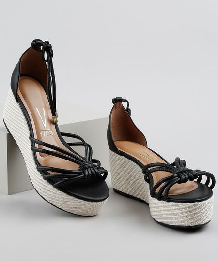 Sandália feminina desenvolvida em material sintético. O modelo possui cabedal fino com detalhe de nó. O salto é plataforma com altura média e revestido em material com aspecto de palha trançada. O fechamento é por nó no tornozelo. A sola é emborrachada.