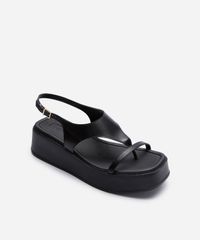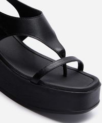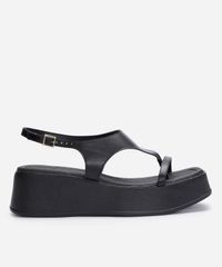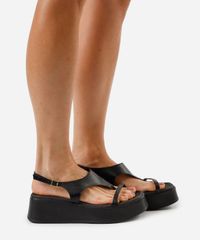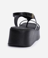 Sandália feminina desenvolvida em material sintético resistente. O modelo tem bico arredondado e cabedal com com tira fina, recorte triangular, suporte para encaixar os dedos e fechamento lateral por fivela com níveis de ajuste. Possui sola com inscrição de marca, salto flatform médio e sola texturizada.