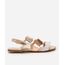 Sandália infantil confeccionada em material sintético resistente com acabamento metalizado. O modelo tem bico redondo e cabedal com tiras triplas com recortes ondulados com recortes e fivela para fechamento e ajuste. Possui solado com leve enchimento e inscrição de marca e a sola é texturizada e auxilia no caminhar.