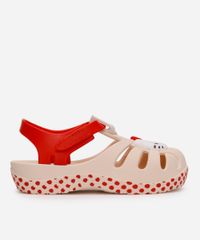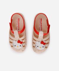 Sandália infantil confeccionada em material emborrachado resistente. O modelo tem bico redondo e cabedal com tiras recortadas, aplicação de Hello Kitty e fechamento por velcro. Possui solado anatômico com inscrição de marca e sol texturizada que auxilia no caminhar.