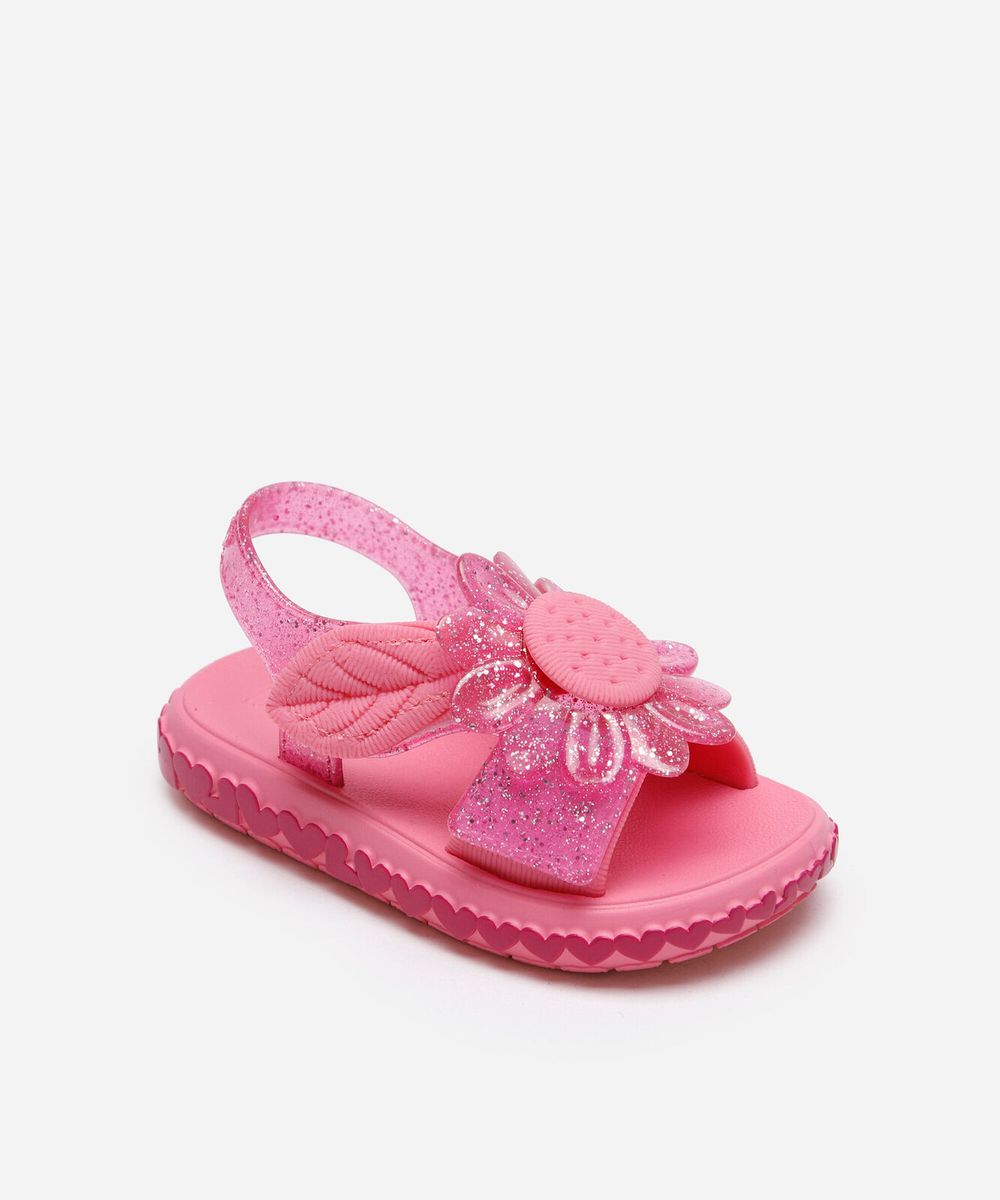 Sandália confeccionada em material emborrachado resistente. O modelo tem cabedal com tiras largas com glitter, aplicação de margarida na parte frontal e fechamento por velcro. Possui solado com leve enchimento e detalhe de corações. A sola é texturizada e auxilia no caminhar.