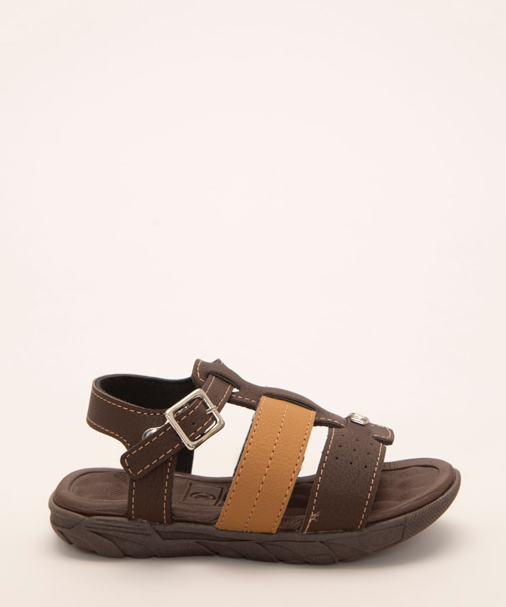 Sandália infantil masculina confeccionada em material sintético. O modelo tem cabedal com tiras médias cruzadas e detalhe com o logo da marca metálico. O fechamento é no tornozelo por fivela e níveis e ajuste. O solado é macio e anatômico. A sola é emborrachada.