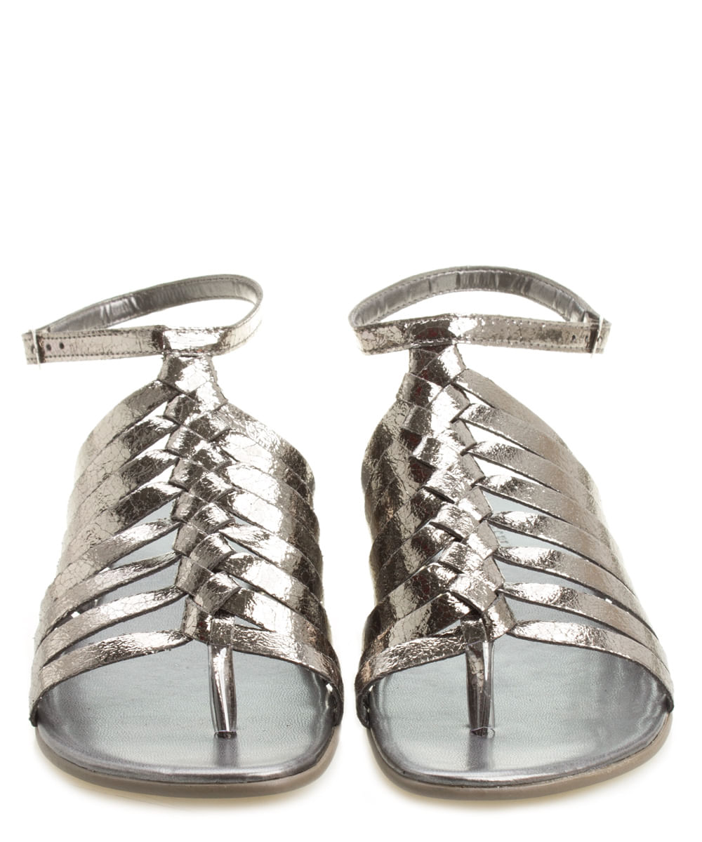 Peça com design moderno, a sandália rasteirinha em tiras possui detalhe trançado na frente, mantendo o pé protegido e super confortável. Fecho em fivela no tornozelo e acabamento metalizada, perfeita para uma produção no final de ano.