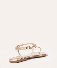 Sandália desenvolvida em material sintético confortável. A peça possui bico redondo, tira única com detalhe de brilhos frontais, palmilha macia e solado emborrachado. Fechamento lateral por fivela com níveis de ajuste.