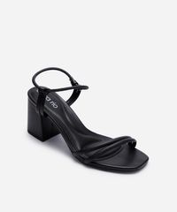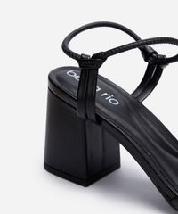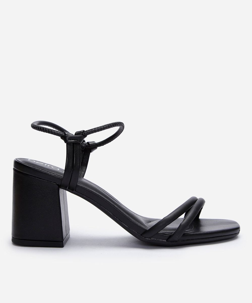 Sandália feminina desenvolvida em material sintético resistente. O modelo tem bico quadrado e cabedal com tiras duplas finas e tira elástica superior que facilita na hora de calçar. Possui sola com inscrição de marca, detalhe metalizado lateral, salto grosso médio e sola texturizada.