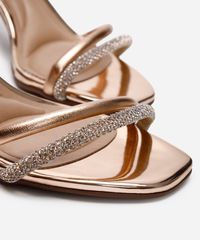 Sandália feminina desenvolvida em material sintético com efeito metalizado. O modelo tem bico quadrado e cabedal com tiras com brilhos e tira elástica para melhor ajuste no tornozelo. Possui solado com leve enchimento e salto grosso, alto com glitter aplicado. A sola é texturizada e auxilia no caminhar.