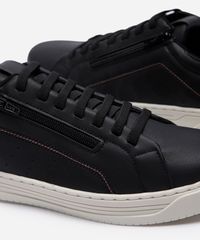 Sapatênis masculino desenvolvido em material sintético resistente. O modelo tem bico redondo e cano curto, cabedal com cadarço elástico e zíper lateral. Possui forro interno com leve enchimento para maior conforto, palmilha macia com inscrição de marca e sola contrastante texturizada.