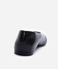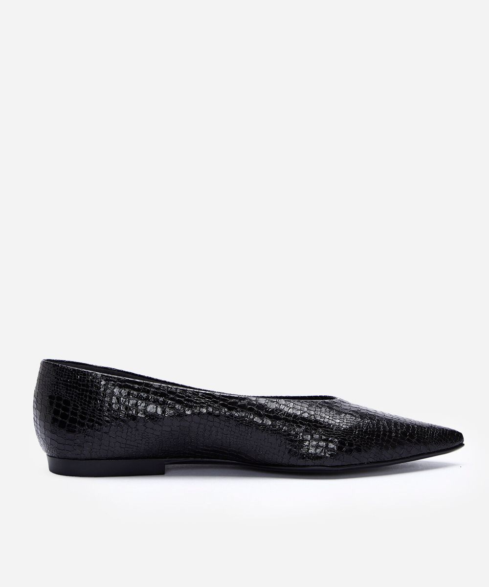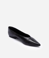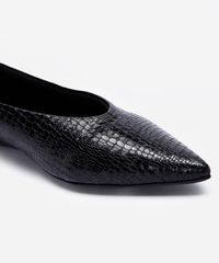 Sapatilha feminina desenvolvida em material sintético com textura croco. O modelo tem bico fino e cabedal liso. Possui palmilha macia com inscrição de marca e sola texturizada.