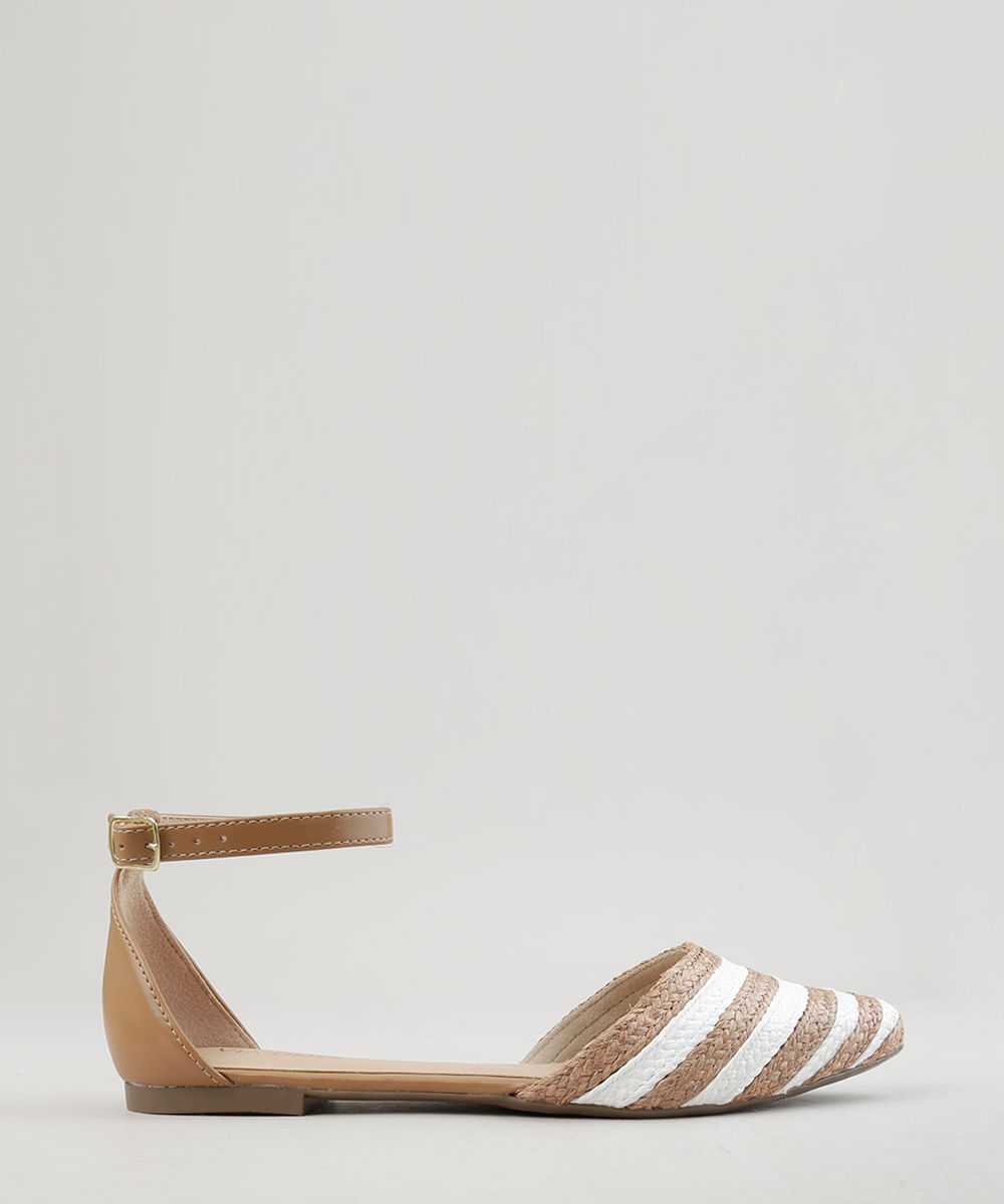 Essa sapatilha foi feita em material resistente com textura. O modelo tem bico fino e estampa listrada. O fechamento é feito por fivela. A palmilha é macia e o solado é emborrachado.