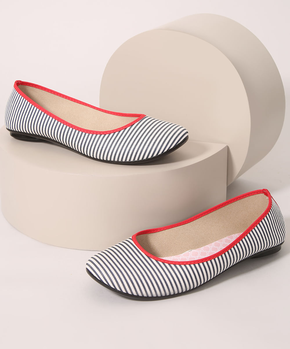 Sapatilha feminina confeccionada em material sintético resistente. O modelo tem padronagem listrada e acabamento em viés em cor contrastante. O bico é redondo. O solado é emborrachado.