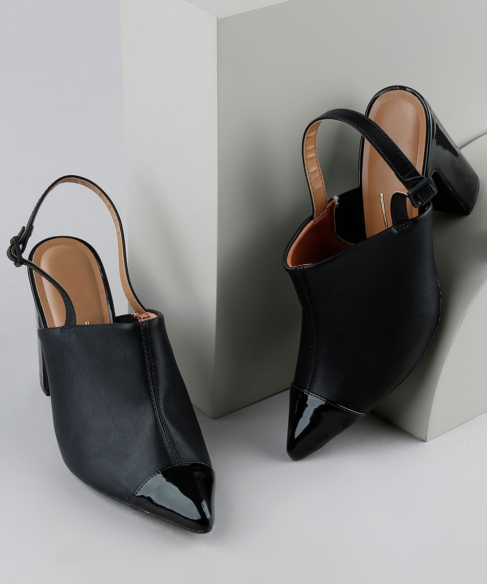 Sapato feminino em material sintético. Modelo salto alto grosso. Cabedal fechado com recorte. Bico fino, detalhe em verniz. Fechamento posterior com fivela e tira com niveis de ajuste.