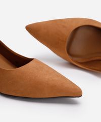 Scarpin feminino desenvolvido em material sintético resistente com textura de camurça. O modelo tem bico fino e cabedal com tira elástica posterior para melhor fixação nos pés. Possui solado com leve enchimento e inscrição de marca, salto fino e alto e sola texturizada que auxilia no caminhar.