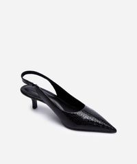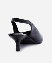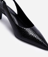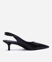 Scarpin feminino desenvolvido em material sintético resistente com textura croco. O modelo tem bico fino, cabedal liso e tira posterior com elástico. Possui solado com leve enchimento e inscrição de marca, salto fino, baixo e sola texturizada que auxilia no caminhar.