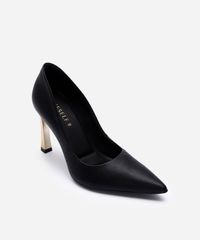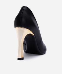 Scarpin feminino desenvolvido em material sintético resistente. O modelo tem bico fino e cabedal liso. Possui solado com leve enchimento e inscrição de marca, salto fino com efeito metalizado, alto e sola texturizada que auxilia no caminhar.