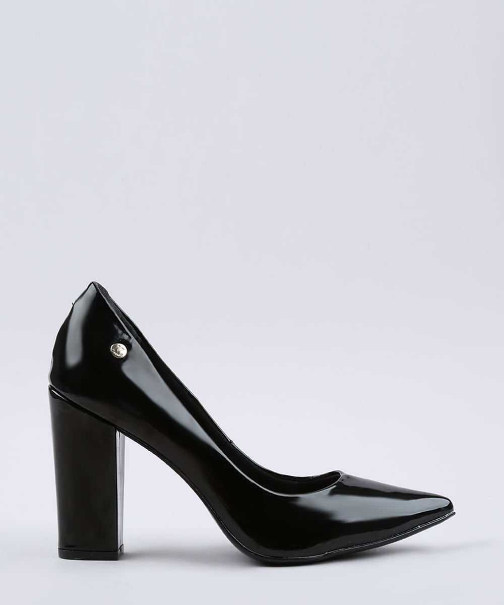 Scarpin feminino desenvolvido em material resistente com aspecto envernizado. O formato do bico é fino. O salto é alto e grosso com sola emborrachada, que dá mais aderência e segurança ao andar.