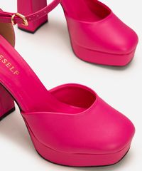 • Salto alto e grosso em bloco com plataforma frontal (meia pata), proporcionando maior equilíbrio e conforto ao caminhar.