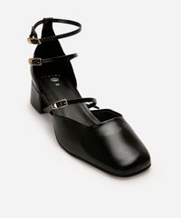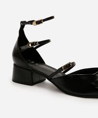 • Design com múltiplas tiras finas e fechamento por fivelas metálicas ajustáveis.