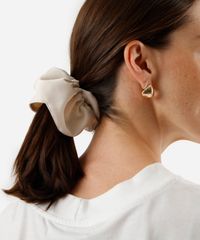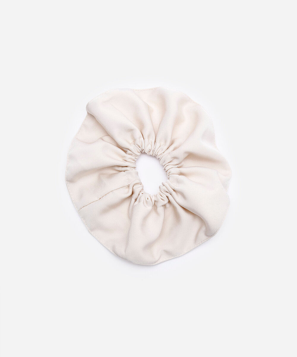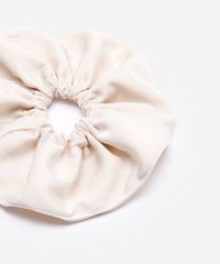 Scrunchie de cabelo confeccionado em tecido plano com toque acetinado e elástico embutido formando franzidos.