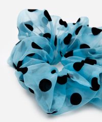 Scrunchie desenvolvida em tecido plano com transparência, estampa poá aveludada e elástico embutido.